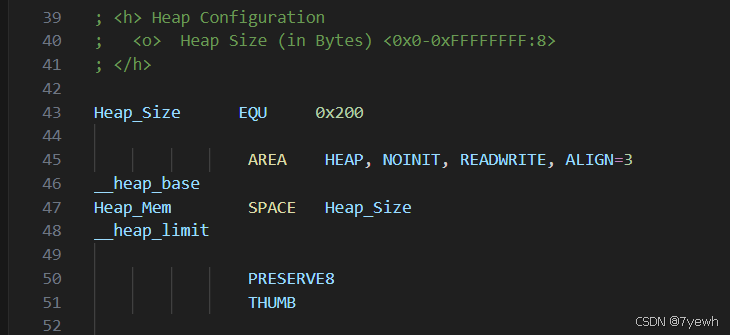 Heap_Size EQU 0x200 defines the size of the heap as 0x200, which equals 512 bytes. The heap is used by C standard library functions such as malloc() and calloc() for dynamic memory allocation. In embedded development, the heap is usually not used very often, so its default size is typically smaller than the stack.