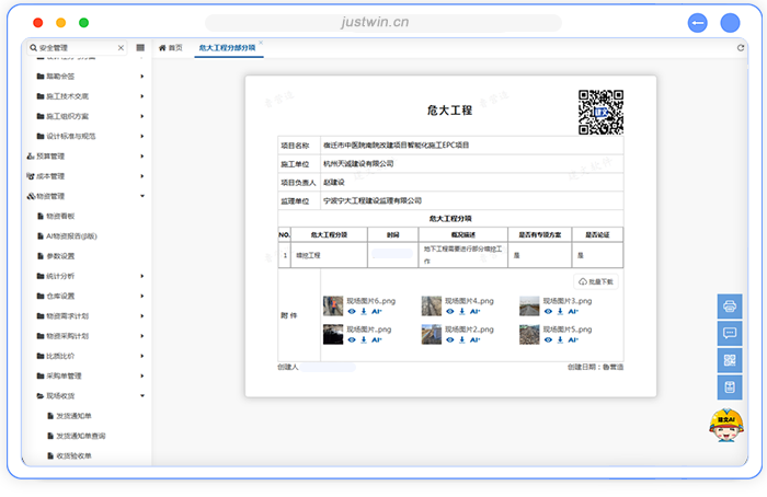 关键场景:对危大工程(如深基坑、模板支架、起重吊装等)强制校验“专项方案审批—专家论证—条件核查—过程旁站—验收”全链条资料齐套性,并与现场监测数据联动。