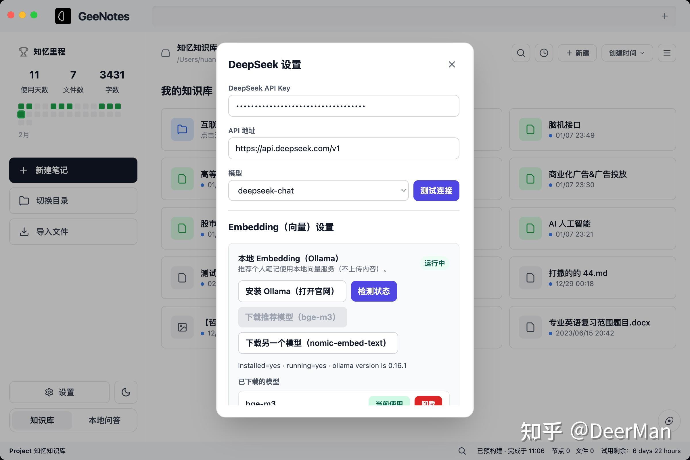 - 本地问答:在选定的文件或文件夹范围内检索相关节点,再调用 DeepSeek 生成回答。检索用的是本地向量索引(支持 Ollama),生成才调用 API,而且可以选择不上传内容