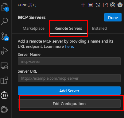 1.2 Cline连接MCP Server,首先点击Vs Code中的Cline,然后点击MCP Servers小图标,再点击右上角加号旁边的小图标,进入新界面后点击编辑 MCP Servers 配置文件,流程如下图所示: