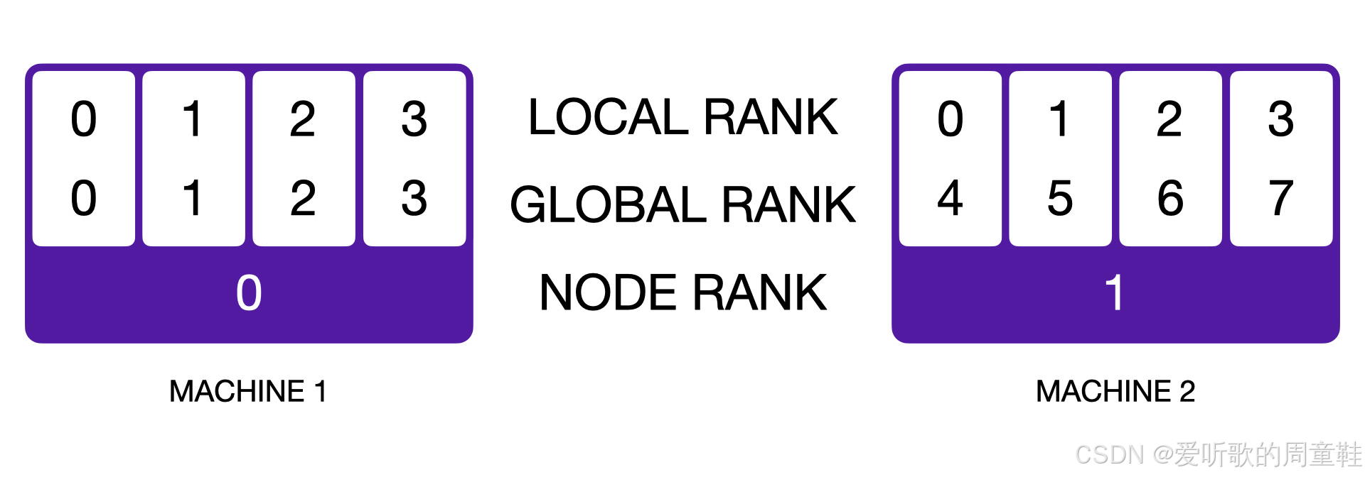 Note:每个 worker 进程都由一个全局 rank(global rank,范围为 0 到 7)和一个本地 rank(local rank,范围为 0 到 3)唯一标识,该图引自:lightning.ai/docs/fabric/stable/advanced/distributed_communication.html