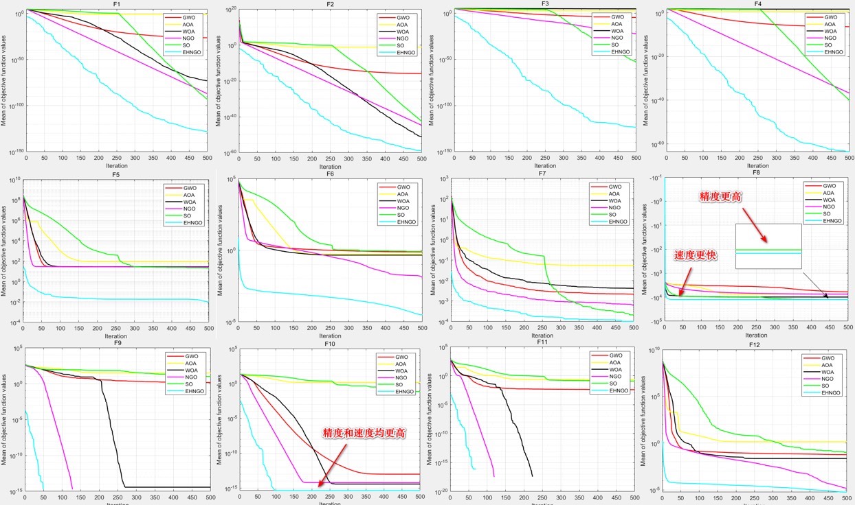 EHNGO算法具有较强的收敛速度与收敛精度,并且在不同类型测试函数均有较好结果,相信其在工程应用上也会有亮眼表现,进行测试函数仿真时AOA算法在F17测试函数上报错了,其他测试函数上就没有问题,所以我在文件夹中放了一个海鸥优化算法(SOA,2021年提出),大家可自己用SOA算法替换AOA算法,方法也很简单,把main文件中AOA都改成SOA就可以啦。最后,还是要推荐一下这款改进的,收敛曲线图上可