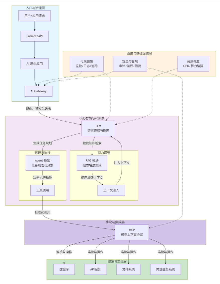 | Infra 层 | 底层基础设施:GPU 调度、流量控制、监控、安全 | 像厨房的水电气、排烟、消防系统 | 用 K8s 管理 GPU,搭 AI Gateway 做路由和限流,接入监控告警 |