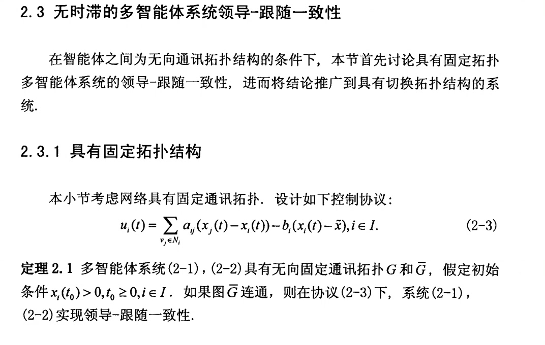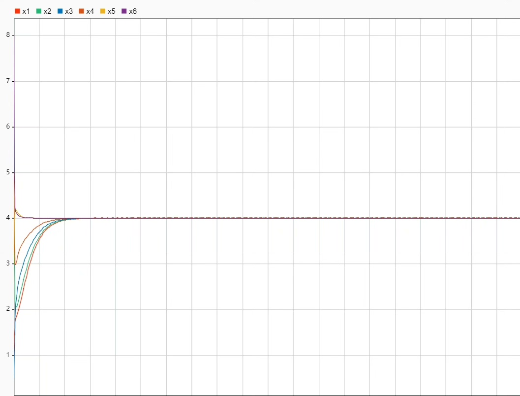 研究一类多智能体系统的领导跟随一致性问题,系统由 一个领导者和多个跟随者组成,考虑跟随者自身状态与控制输入之间的依赖性设计一致性协议在系统中智能体初始状态为正值的条件下, 首先 ,在无向通讯拓扑图 下,利用代数图论,矩阵论和稳定性理论,得到了具有 固定或切换拓扑结构的系统实现领导跟随一致性的充分条件进而,在有向通讯拓扑 图下,讨论具有通讯时滞系 统的领导跟随一致性问题 结果表明 ,系统实现领导跟随一致性与跟随者之间的通讯时滞无关仿真结果验证所得结论的有效性。 利用simulink搭建一致性算法复现有一下三种场景 1,领导节点的状态变量为4,跟随者跟随到4 2.领导节点的状态变量为2,跟随者状态变量跟随到2 3.领导节点的状态变量为4,且各个节点之间存在通信时延。 跟随者状态收敛至4。