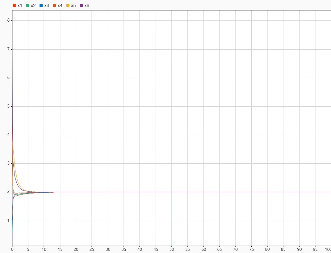 当领导者的状态设为4时,仿真中出现了一个有意思的现象:跟随者初值在0-5之间随机分布,但收敛曲线像被磁铁吸引一样(见图1)。秘诀在于协议中增加了领导者的牵引项: