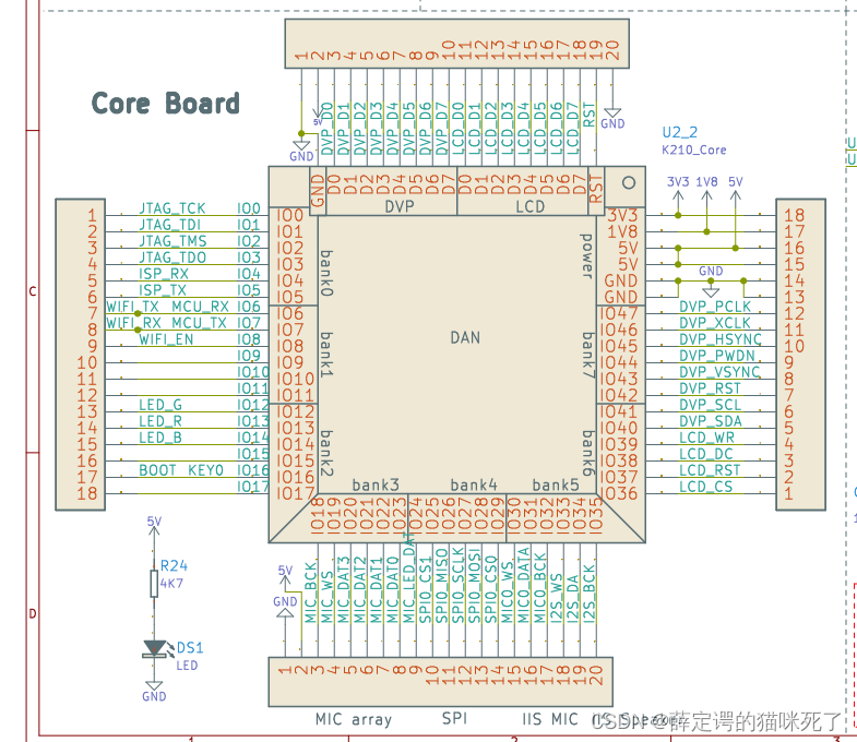 可以看原理图,这是板子上的引脚,需要挂载芯片上的引脚,才能发挥特定的功能。数数是20+20+18+18 = 78 个引脚。这个板子把所有的引脚的都引出来了,包括LCD屏的8080口,所以有些引脚并不能用,例如LCD_D0~LCD_D7,DVP_D0~DVP_D7。上面写着IO0~IO47,这些都是好使的,但是也有几个特殊的,IO36~IO47,这几个都是控制LCD和DVP的,也别用。