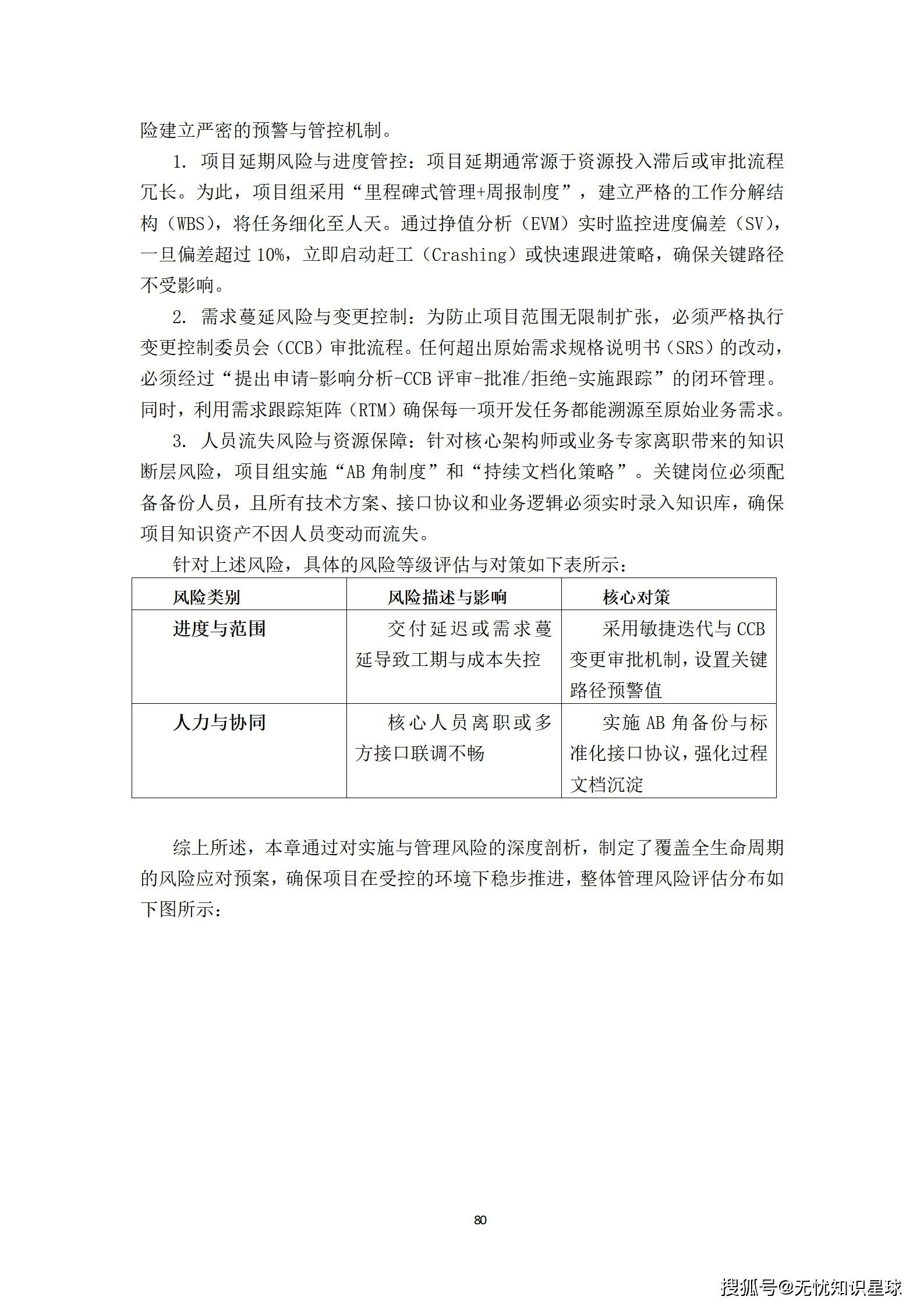 - 项目延期:采用里程碑式管理与挣值分析(EVM),实时监控进度偏差。
