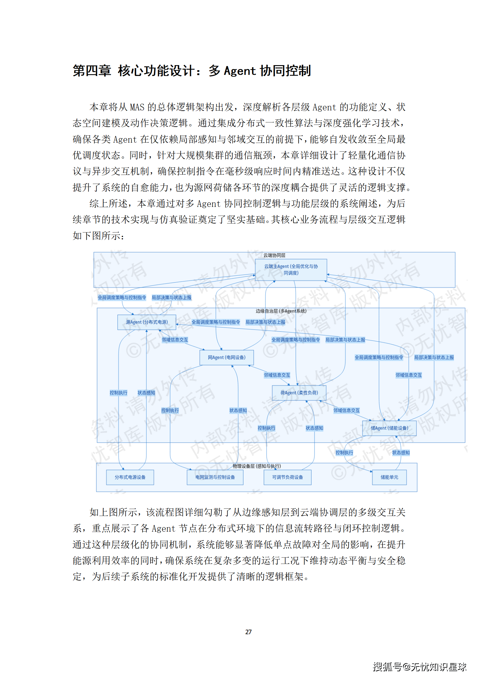 本章是技术方案的核心,聚焦于多Agent系统(MAS)在“源网荷储”一体化协同控制中的深度应用。针对新型电力系统下海量分布式资源带来的通信延迟、计算压力及鲁棒性挑战,构建了基于自律协同机制的分布式控制架构。