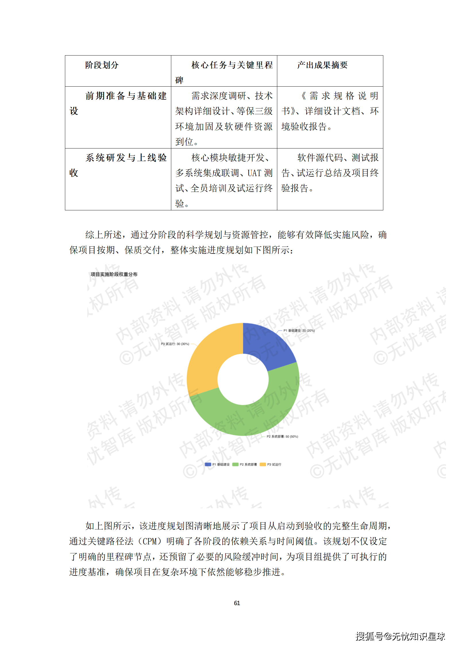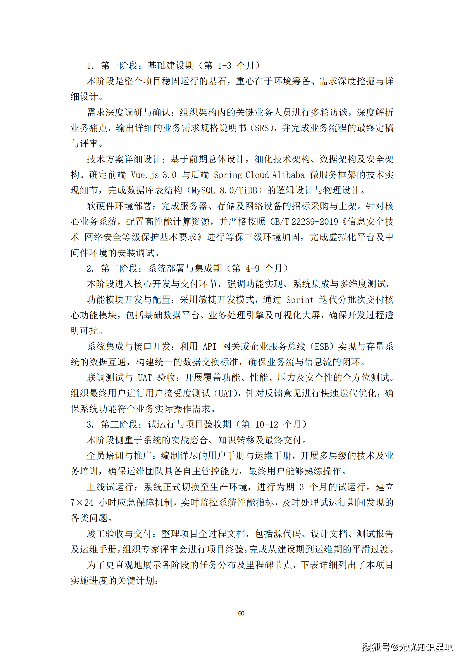 - 基础建设期(第1-3个月):完成需求深度调研与确认,输出SRS。完成技术架构详细设计与软硬件环境部署(等保三级加固)。