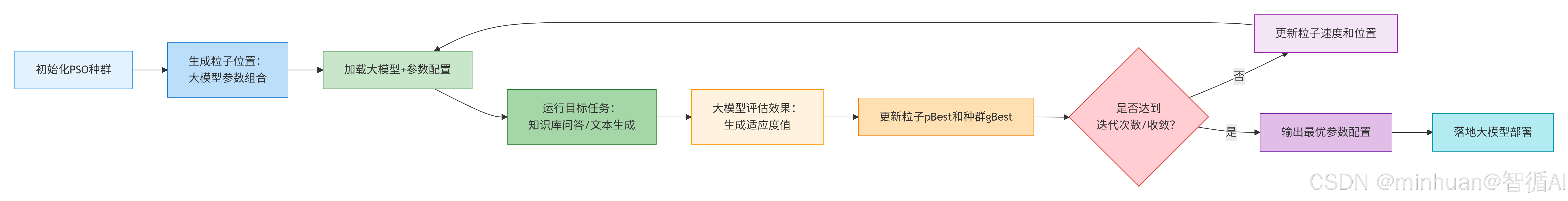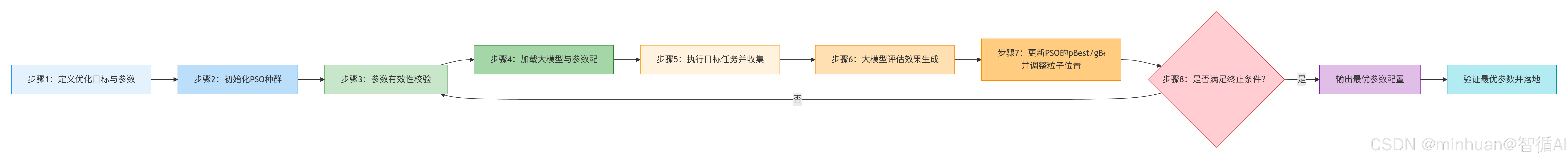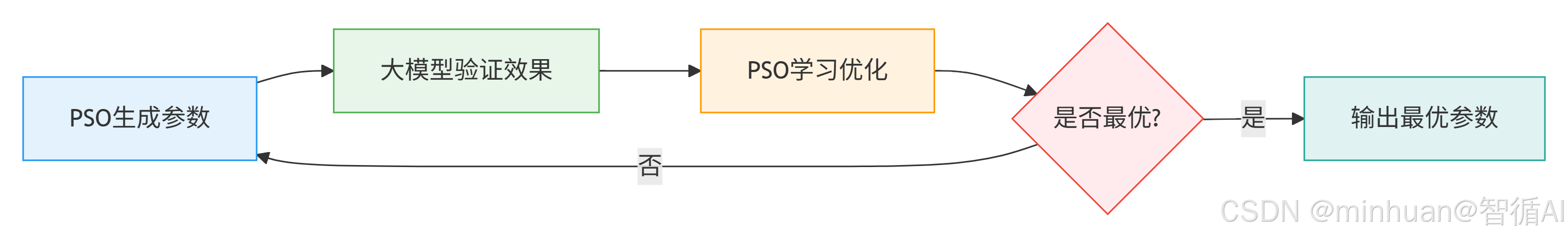 简单来说,整个执行流程是“PSO 生成参数→大模型验证效果→PSO 学习优化→再验证→直到最优”的闭环,把人工调参的“试错 - 评估 - 调整”过程完全自动化。