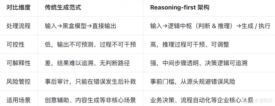 面对生成式 AI 的决策痛点,企业 AI 推理的核心解决思路,是构建 Reasoning-first(推理先行)的系统架构,彻底改变传统 AI“直接生成、立刻执行” 的旧范式。Reasoning-first 架构将企业 AI 推理从 “可有可无的副产品”,转变为企业 AI 系统的核心模块,让推理成为所有生成和执行行为的前置逻辑,从系统层面保障 AI 决策的可控性。