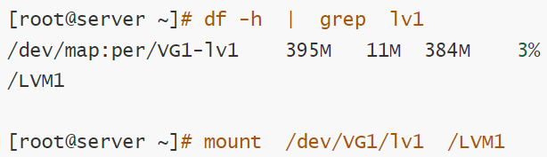 基于上例,VG1 卷组划分出200MB空间的逻辑卷并格式化挂载使用: