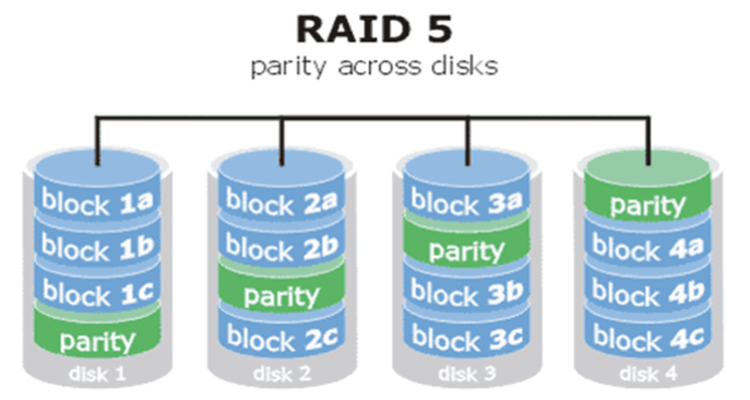 原理:需至少三块硬盘,将数据分块存储到不同硬盘中,硬盘中必须存储其它一个硬盘的parity(奇偶校验信息)