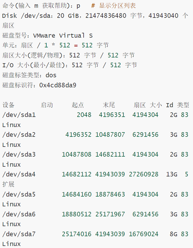 | p | 显示当前磁盘的分区信息 |