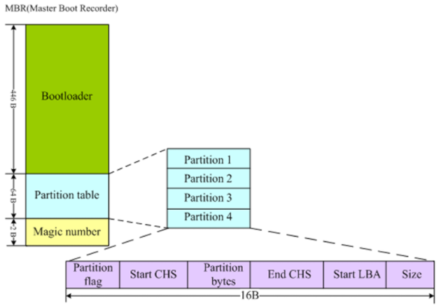 MBR 最多只能有4个主分区:因为分区表占据64个字节,其中每个分区的信息占用16个字节,分区表里面可以记录四个分区信息描述。