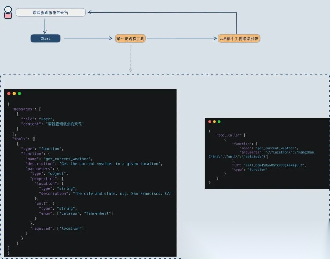 - 第一次调用:将用户的问题(比如“查询北京今天的天气”)和所有工具的定义,一起传给大模型;大模型通过推理,判断出“需要使用天气查询工具,参数是城市:北京,日期:今天”,并返回这个判断结果。
