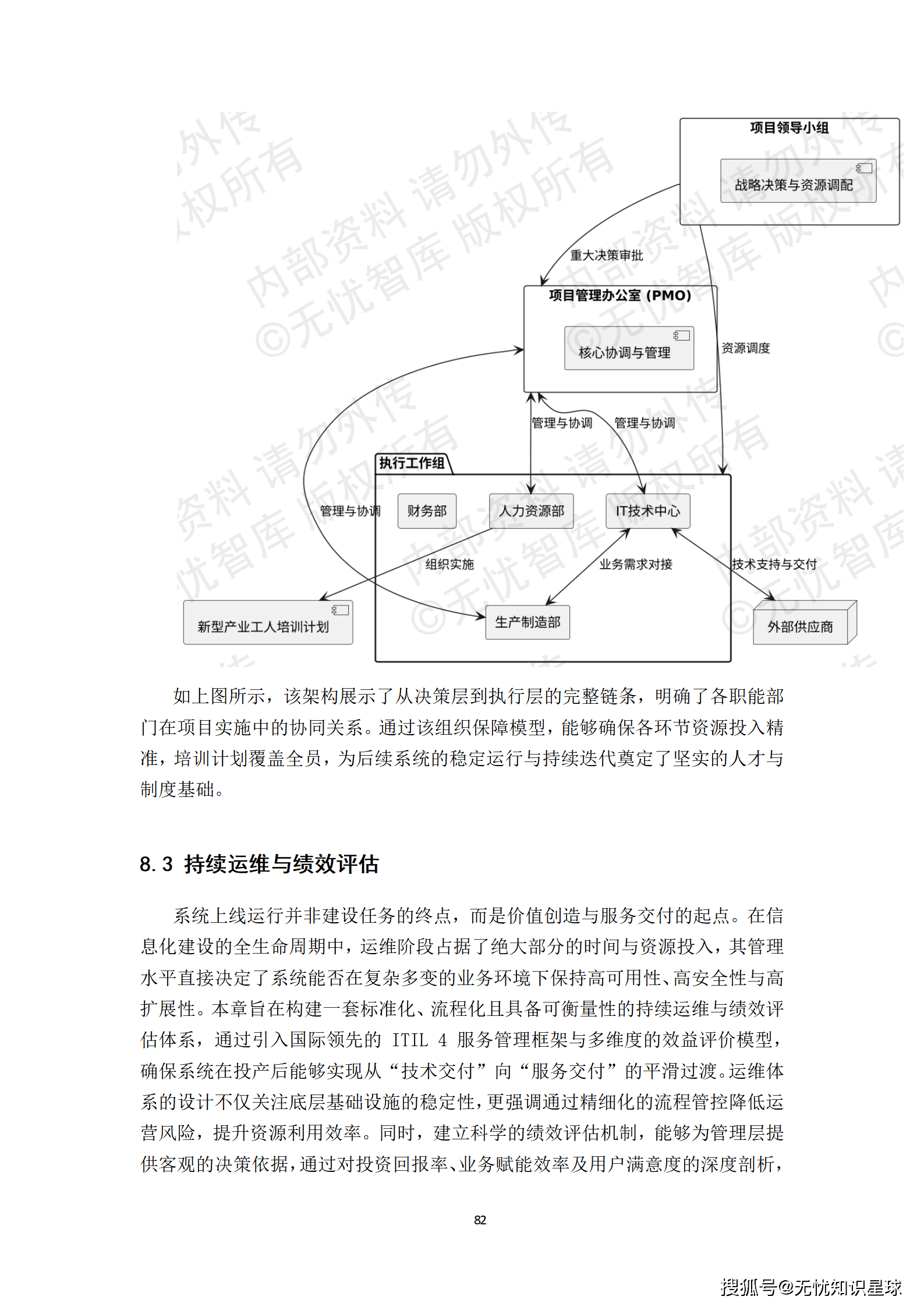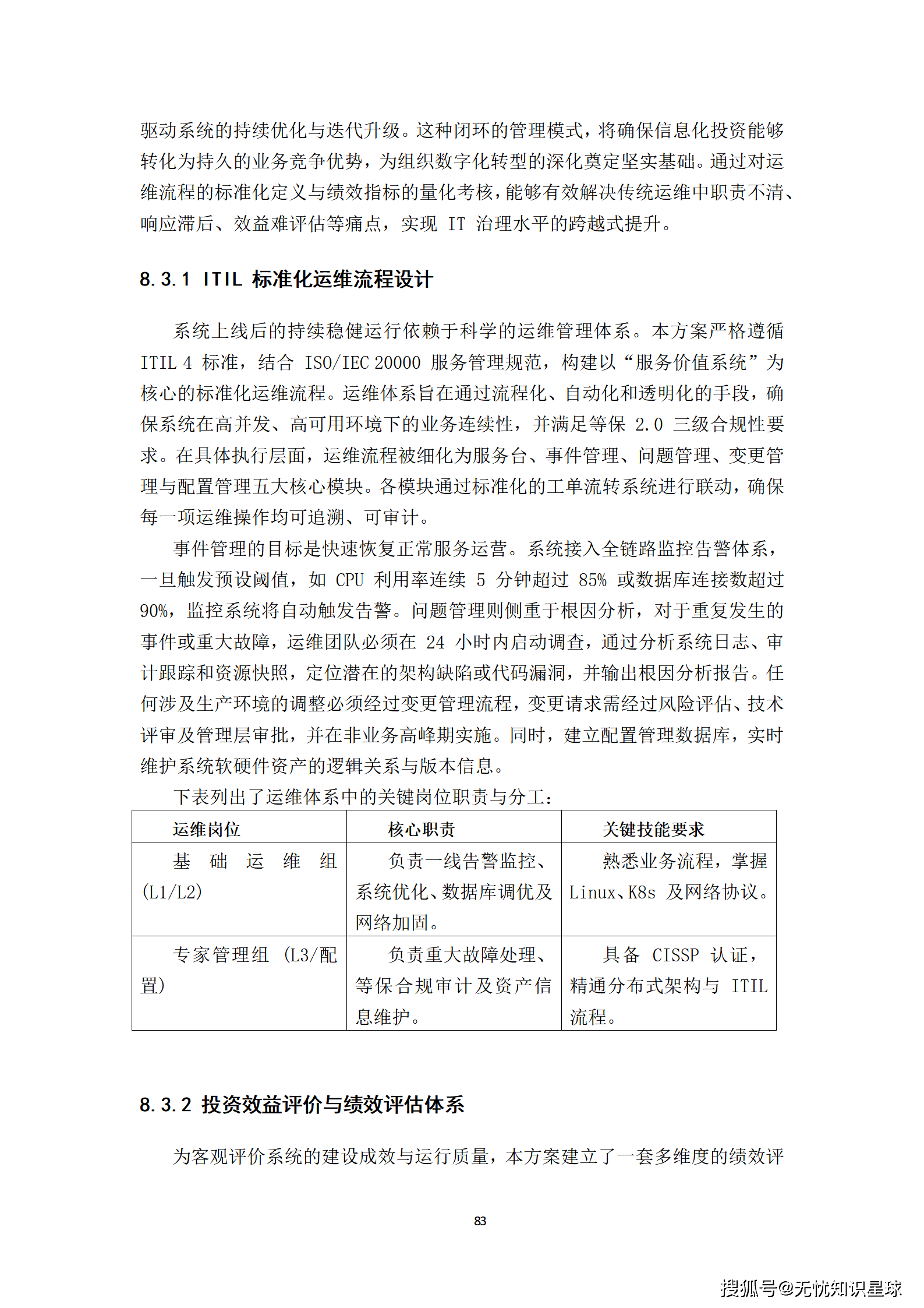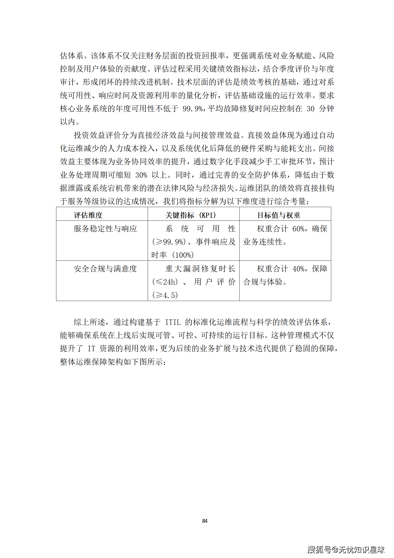 - 绩效评估体系:服务稳定性:可用性≥99.9%,事件响应及时率100%。安全合规:重大漏洞修复≤24h。投资效益:量化人力成本节约与业务效率提升。