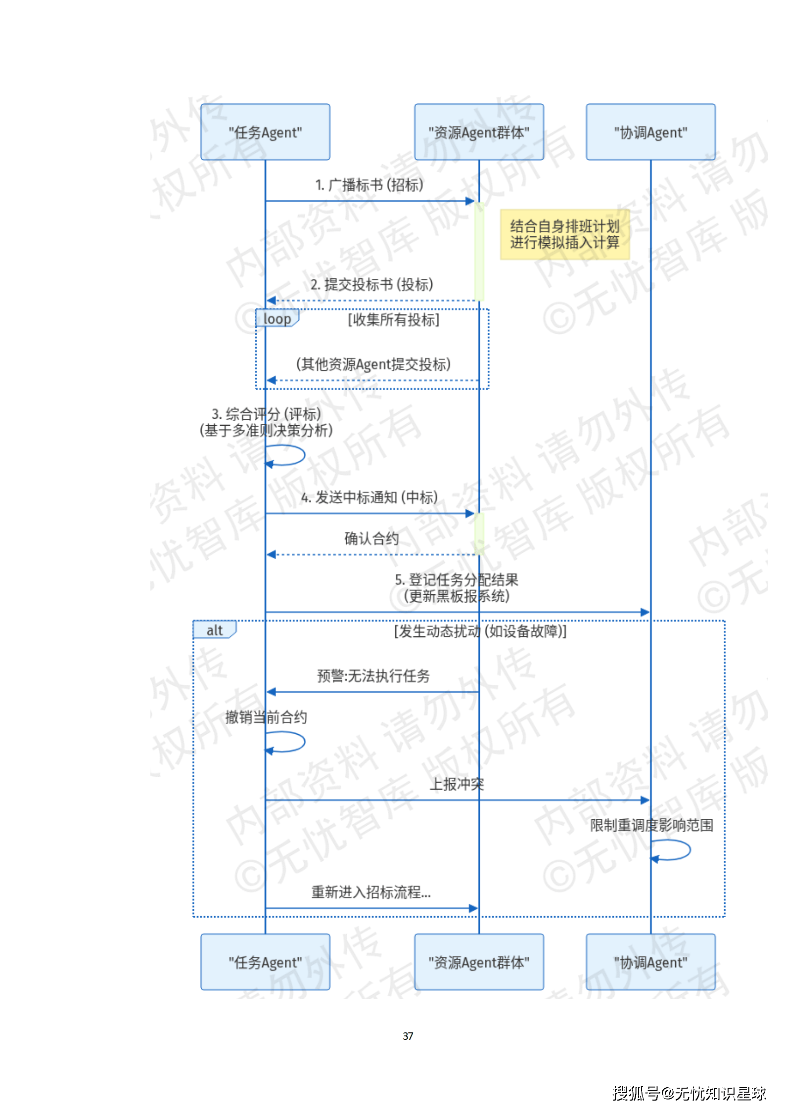 - 招标阶段:任务Agent向潜在的资源Agent群体广播标书(包含加工参数、时间窗口、优先级)。