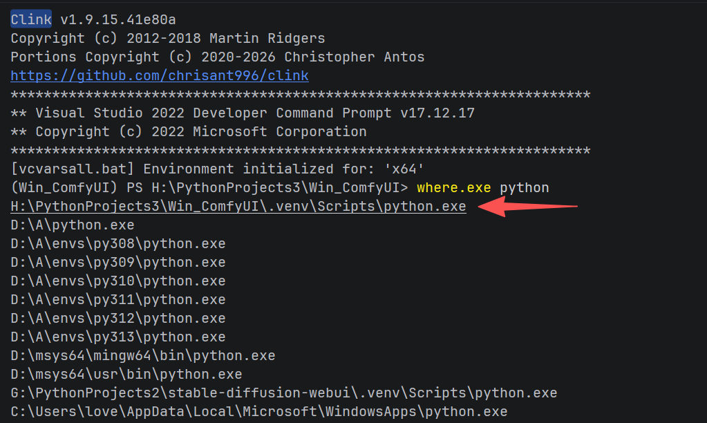 但极其诡异的是,当你输入 where python 时,系统返回的根本不是当前虚拟环境的 Python,而是系统全局的 Python 路径!