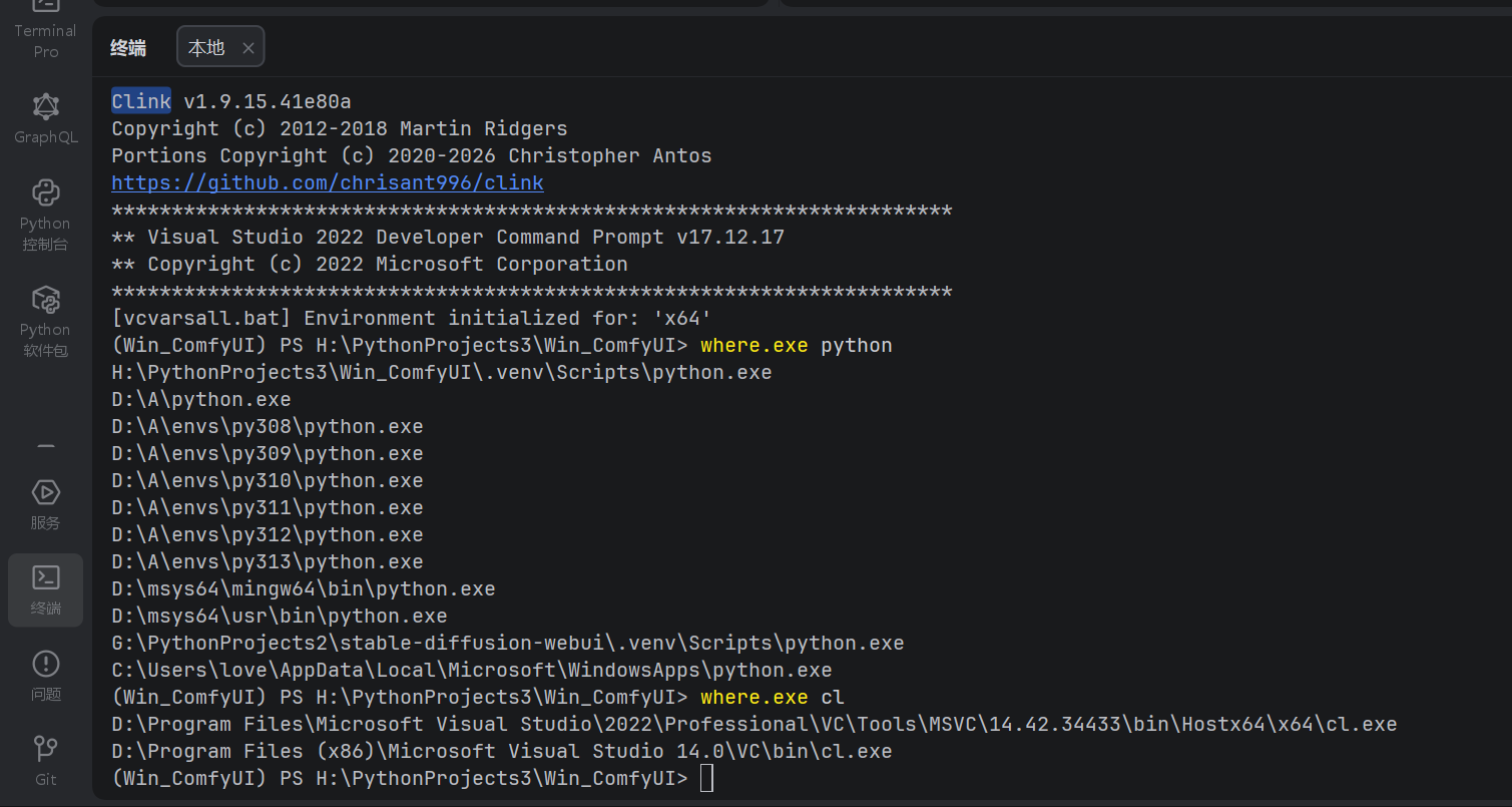 where.exe cl👉 必须成功输出 VS 2022 目录下的cl.exe路径(证明 C++ 编译链挂载成功)。