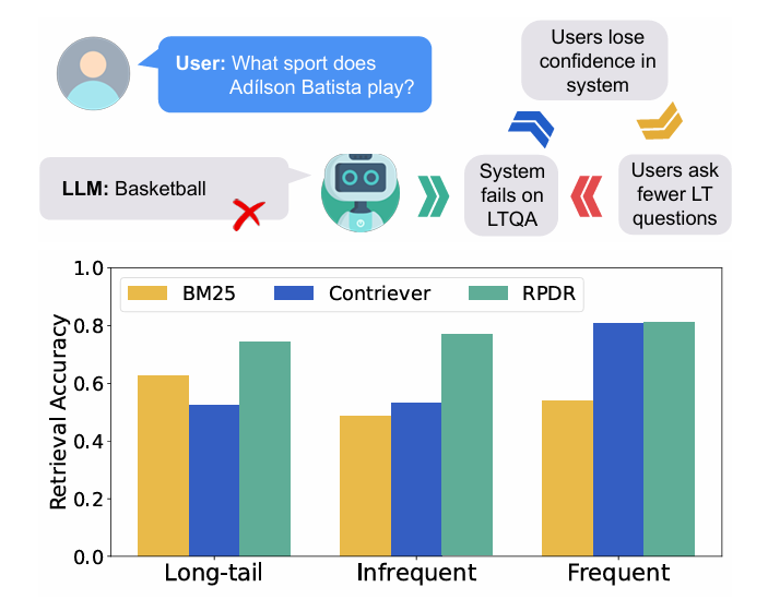 传统解法是用检索增强生成(RAG),但问题来了:检索器本身也对长尾实体"脸盲"。过去的研究认为,密集检索模型(把文本编码成向量再匹配)在长尾场景下甚至不如BM25这种老牌方法。