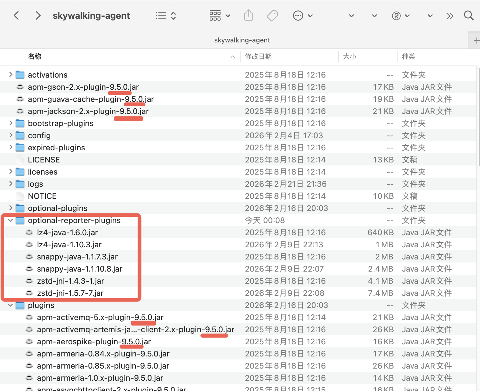 6、Skywalking agent 9.5.0(当前20260223最新版本)optional-reporter-plugins中的压缩工具不支持MacOS arm架构(里面没有其动态库),如在ARM 架构Mac OS上验证,可单独升级使用的压缩工具,如:snappy-java-1.1.7.3.jar ---->升级为snappy-java-1.1.10.8.jar