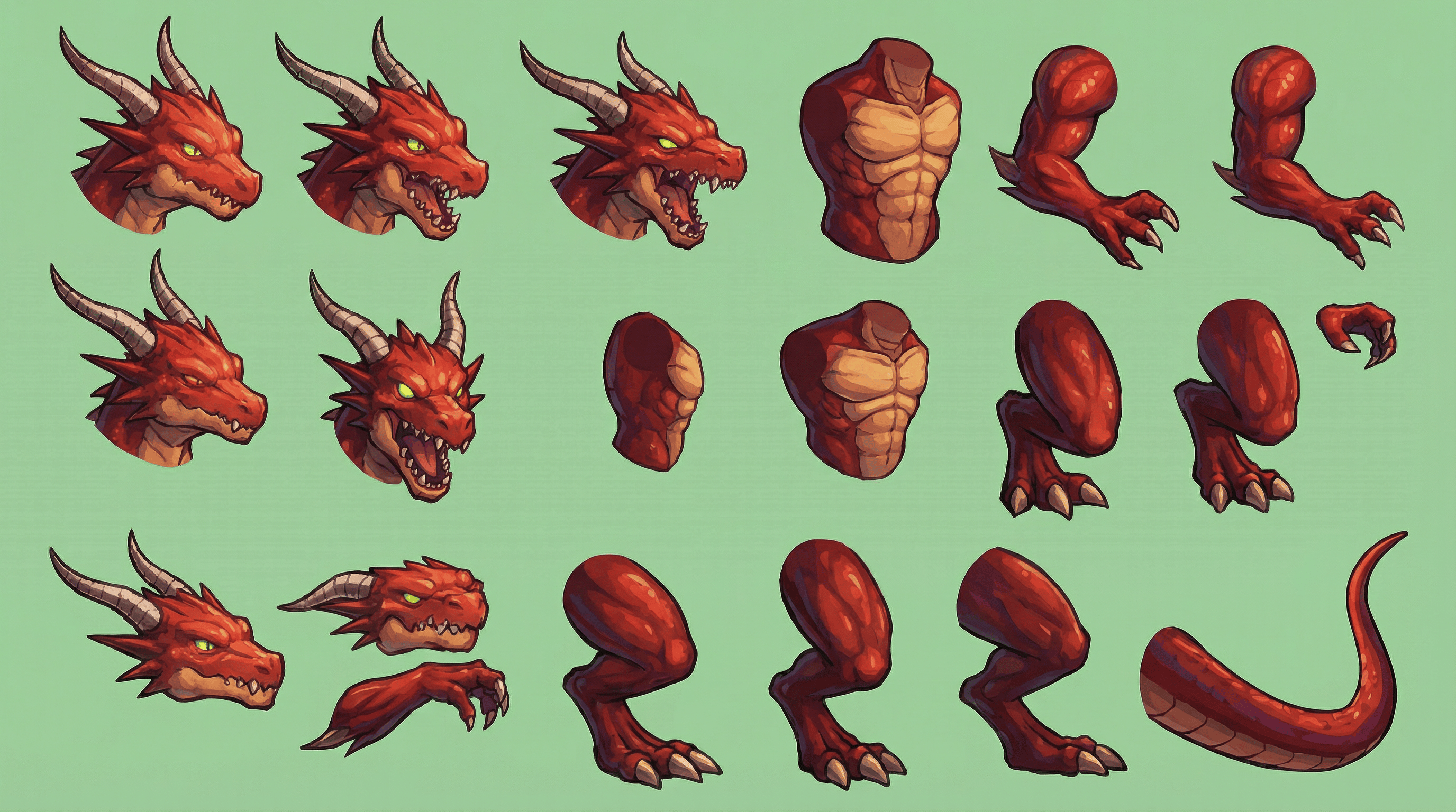 - 周围分散的独立部件:头部(带不同表情:平静、吼叫)、躯干、前腿、后腿、尾巴、背部的棘刺(分开几根)、眼睛(单独)