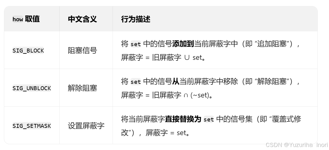 sigprocmask的行为由how决定,set和oldset分别用于指定新的信号集和保存旧的信号集