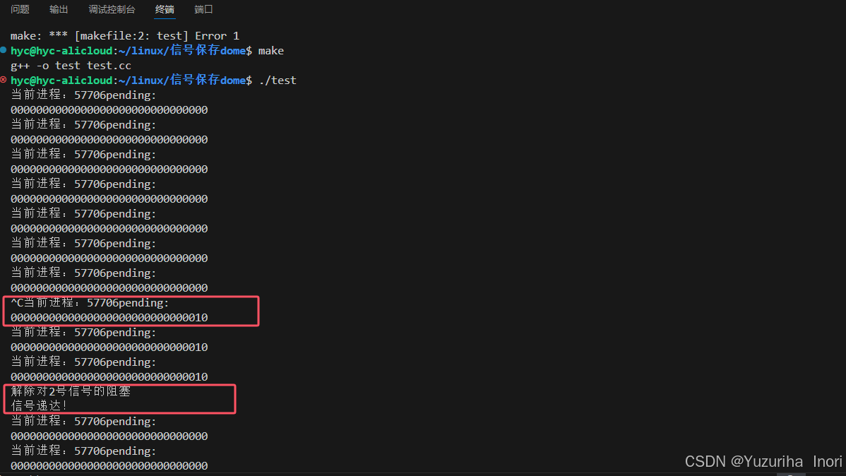 我们可以看到:在还没有解除2号信号阻塞时,信号确实接收到了!但没有递达。当信号阻塞解除时,信号立马递达了!