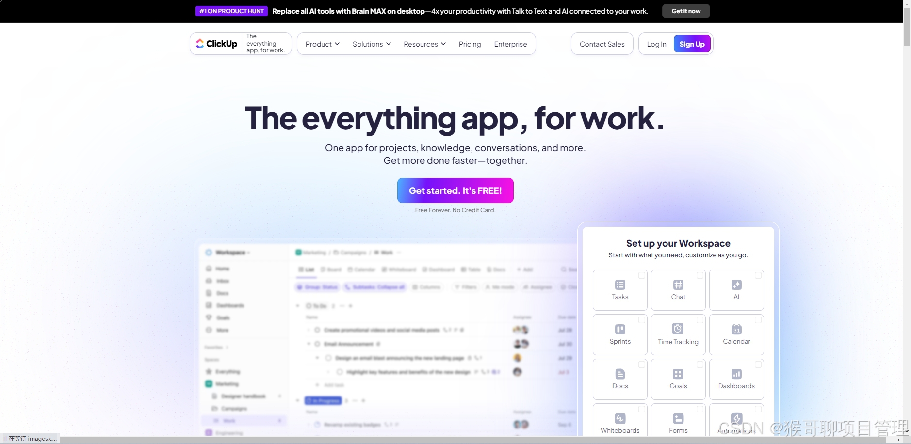 协作能力:支持万人级团队协作,全球1000万+团队使用,具备精细化权限管理、跨部门沟通专区、实时进度同步功能;内置ClickUp Brain AI助手,可24小时提供智能支持,减少团队沟通成本,实现“人、AI、工具”无缝协同。