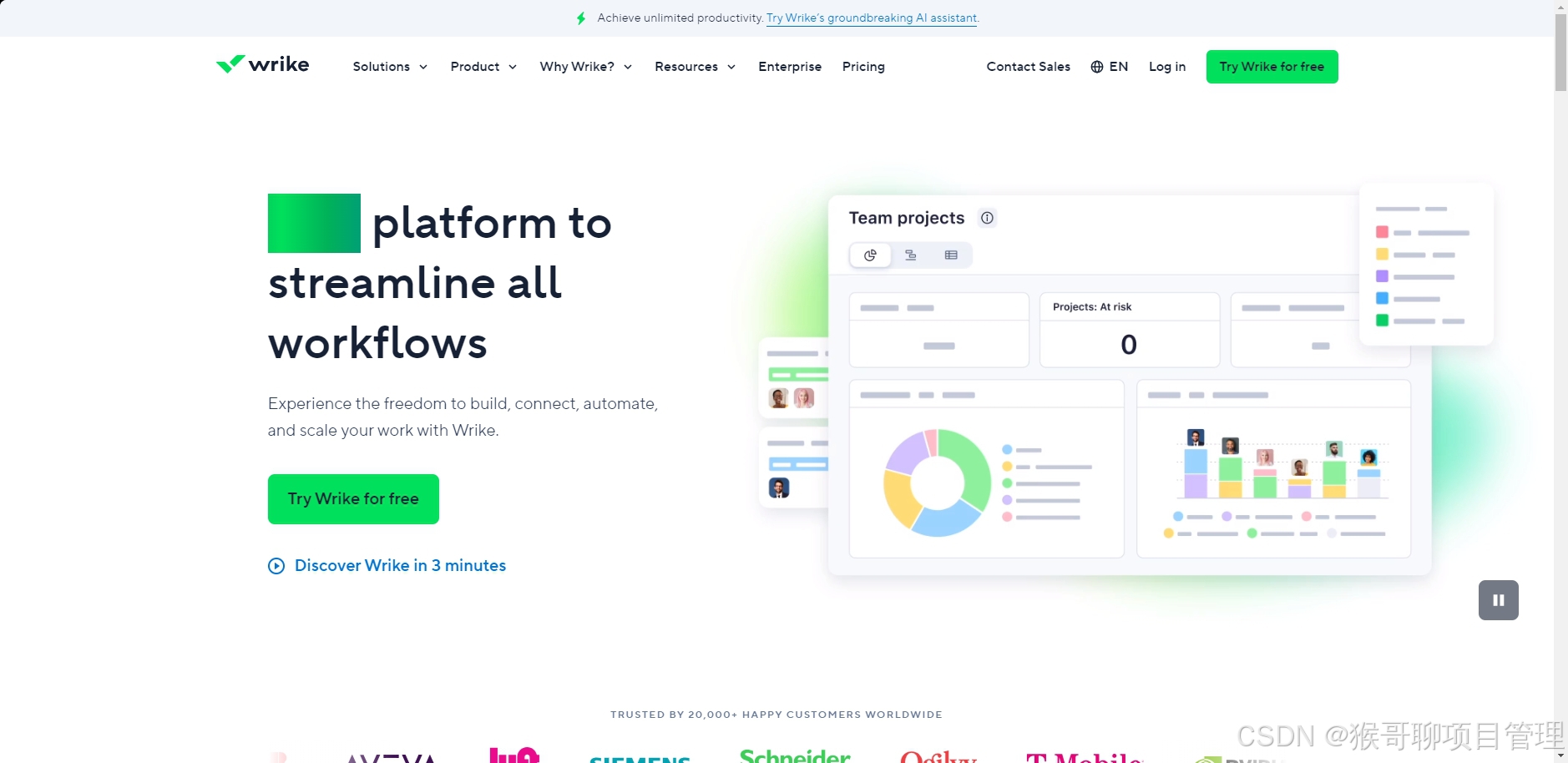 核心定位:全球领先的企业级协同工作管理平台,连续三年被Gartner评为协作工作管理领域领导者,主打规模化协作与流程优化,适配各类大型企业,尤其适合多项目、跨部门协同场景。