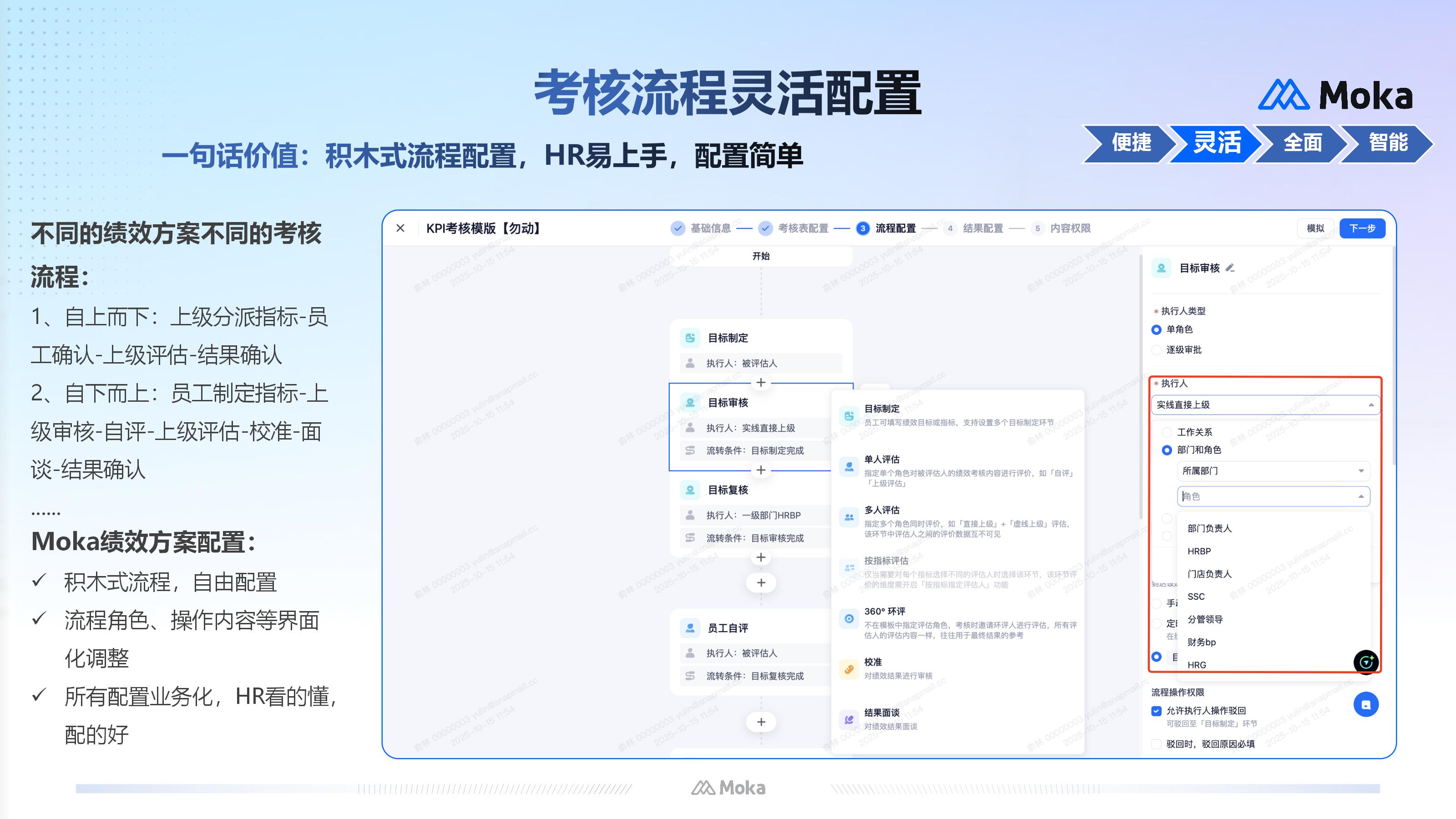 无需人工进行数据的二次录入与传递,减少数据流转中的误差与耗时,让绩效反馈的价值能快速延伸至其他人力资源管理环节,实现绩效管理的一体化闭环,这也是提升绩效反馈整体效率的重要环节。Moka 的人事管理一体化解决方案,可实现 KPI 考核与薪酬、绩效、假勤等模块的打通,让绩效反馈数据无缝流转,助力绩效管理效率提升。