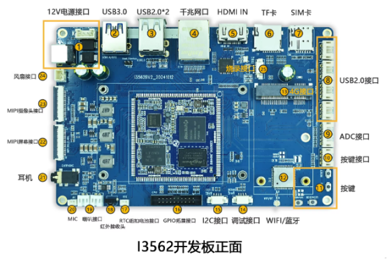 I3562 开发板正面接口布局清晰,主要接口如下: