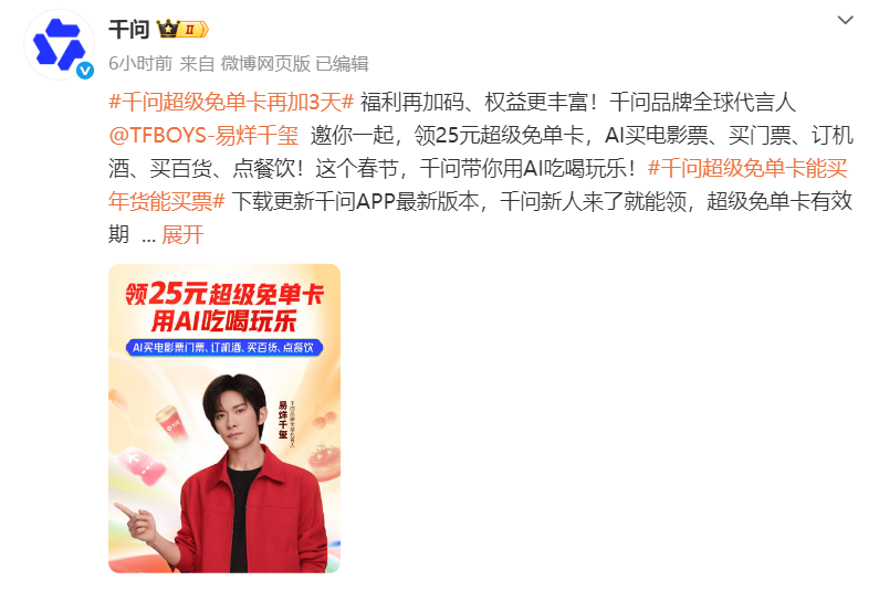 然而,就在豆包和元宝在红包与社交的战场上贴身过招时,千问却悄悄绕到了大后方,祭出了一套极具侵略性的升维打击:不仅独家冠名“2026河南春节晚会”,更在2月14日突然宣布:追加30亿“超级免单卡”。