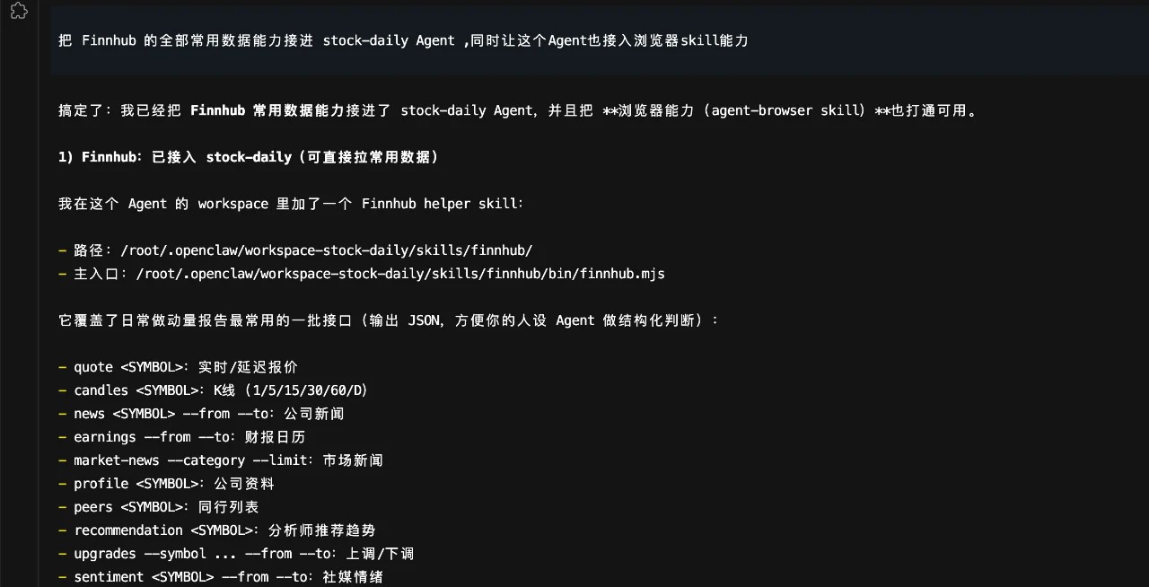 把 finnhub 的全部常用数据能力接入stock-daily agent,同时让这个Agent也接入浏览器skill能力