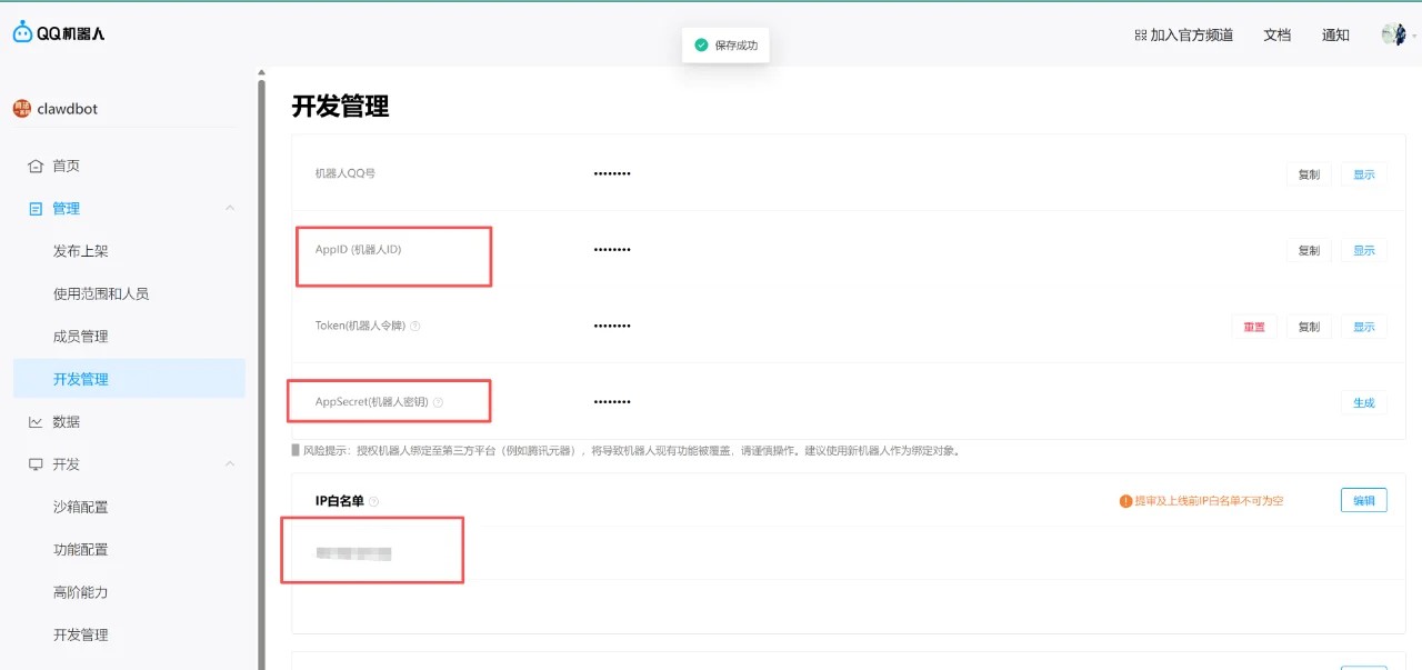 在管理页面获取到当前机器人的AppID, 和AppSecret,并且把自己的服务器IP填入到白名单中。