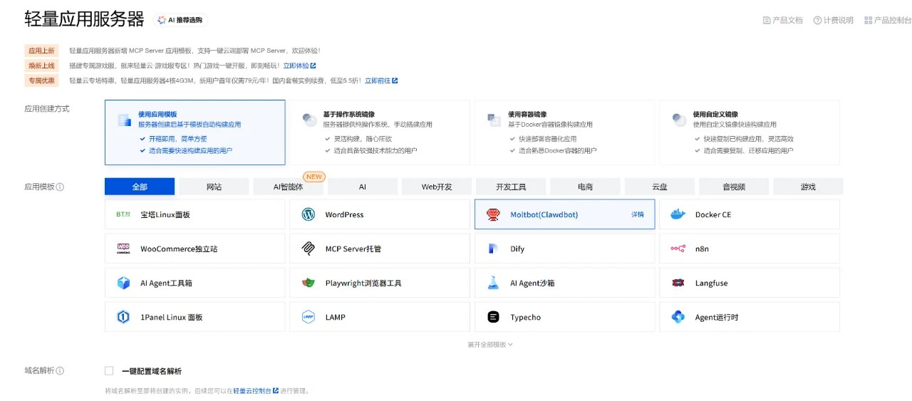 来到腾讯云网站,我们可以看到腾讯云已经适配好了Clawdbot,选择“轻量应用服务器”,然后最低配的版本: