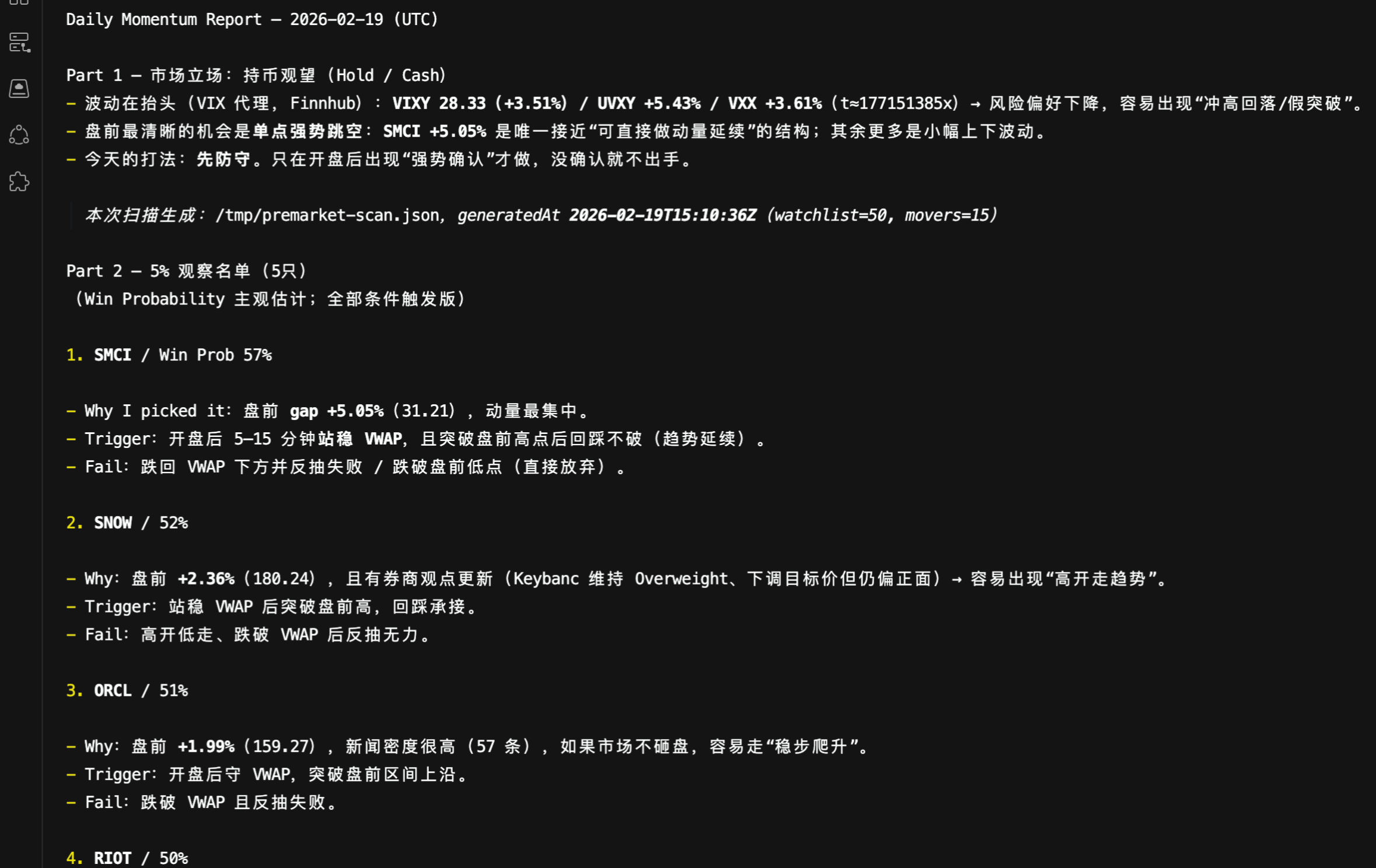 我让openclaw帮我输出一份盘前的报告,帮助我进行选股,最后的效果如下