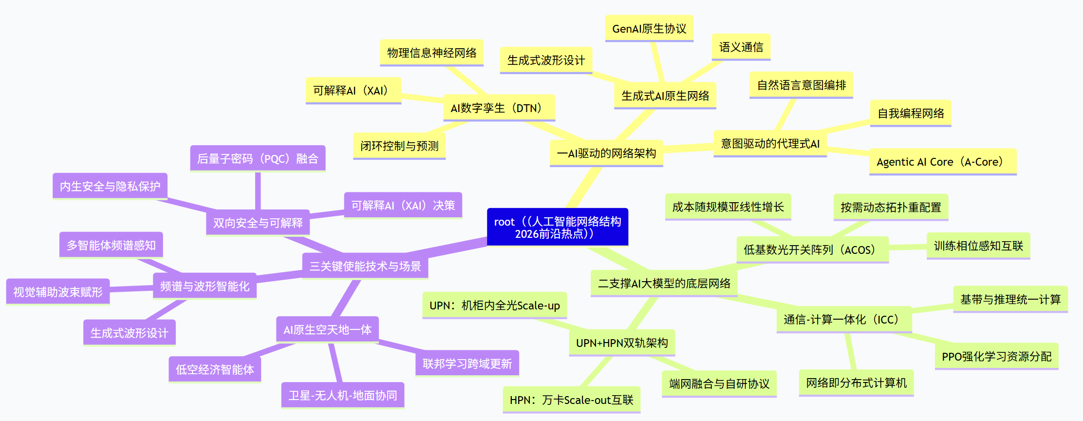 2026年人工智能与网络技术正经历深度融合。AI驱动的网络架构革命包括生成式AI原生网络、意图驱动的代理式网络和数字孪生网络,推动网络从传输管道向智能体转变。为支撑AI大模型训练,创新网络结构如UPN+HPN、双轨架构、低基数光开关阵列和通信-计算一体化架构正在突破传统互连限制。同时,AI原生的频谱管理、空天地一体化智能体协调及网络安全成为关键使能技术。这些发展标志着网络正从"可编程&q