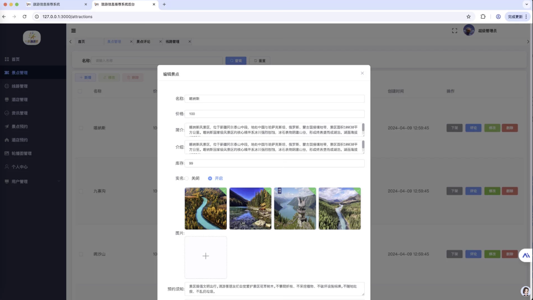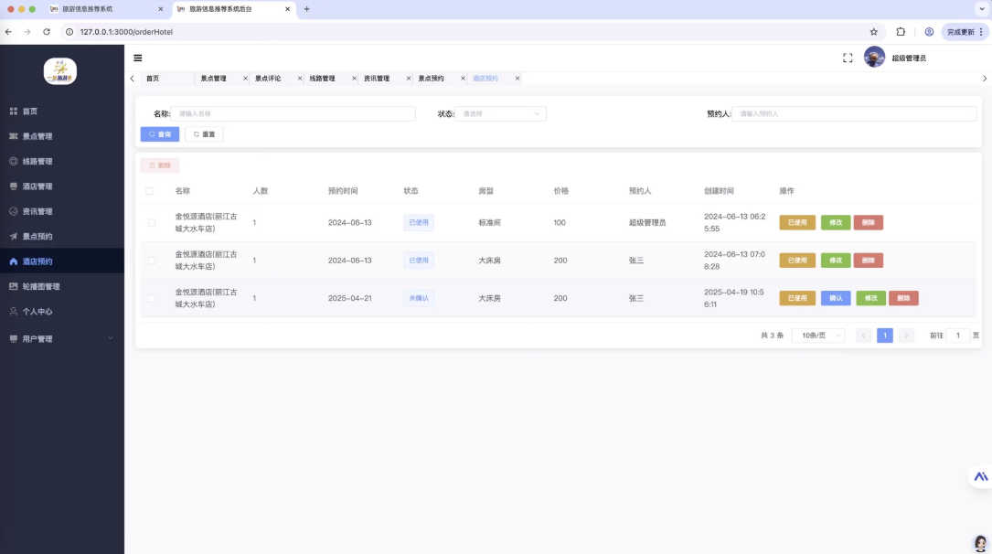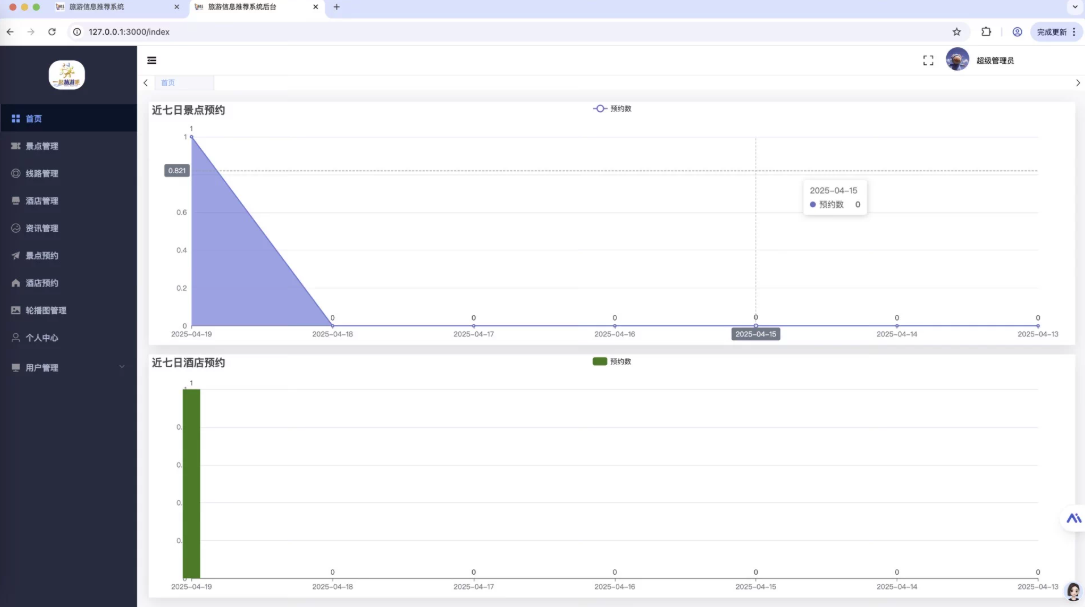 ③:后台管理:首页统计图表、景点管理、路线管理、酒店管理、咨询管理、景点预订管理、酒店预约管理、个人中心、轮播图管理、用户管理、管理员管理等