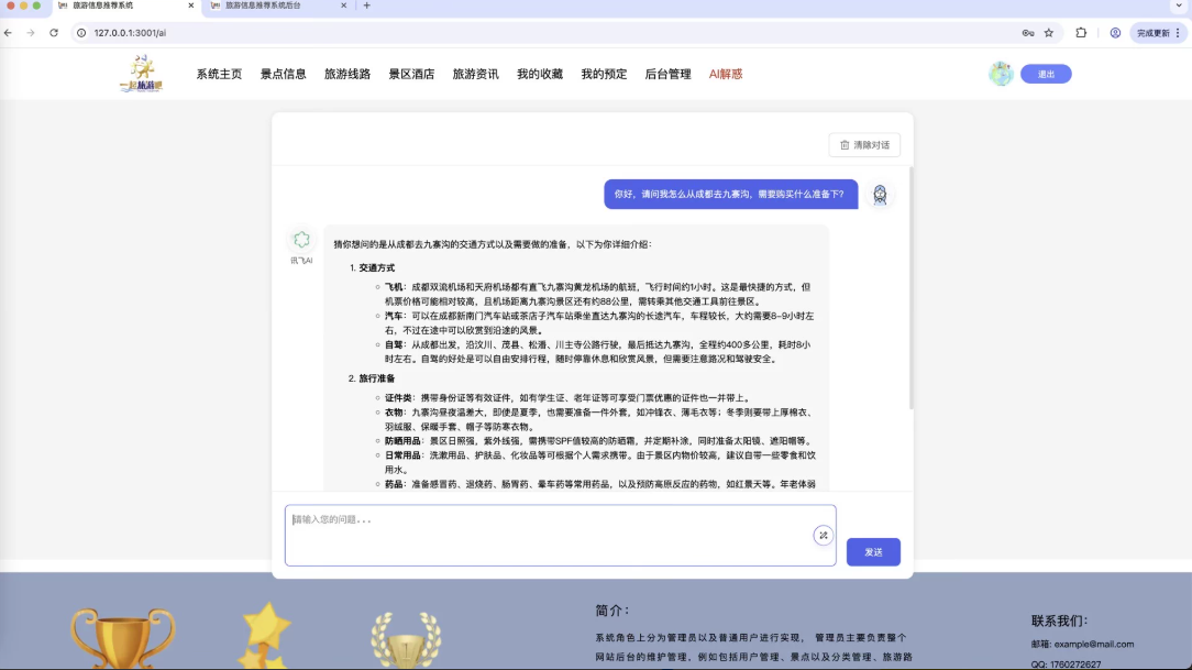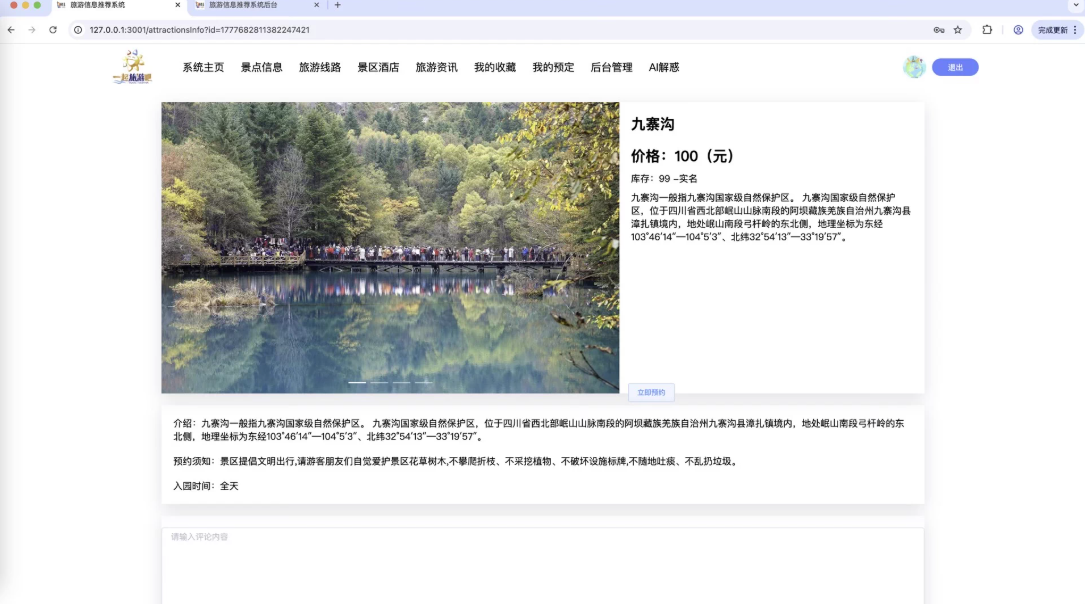 ②:用户前台:首页轮播图、景点信息及预订、旅游路线、旅游咨询、景区酒店及预订、我的收藏、我的预订、AI智能沟通、个人中心等