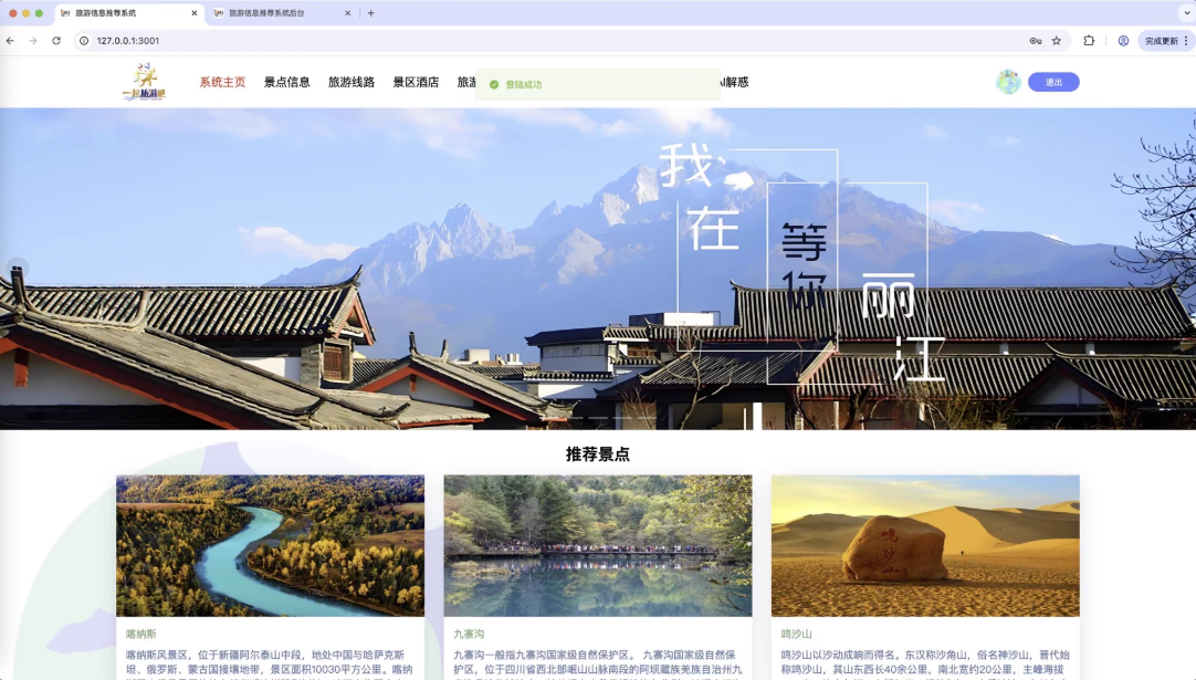 本系统围绕旅游业务全流程,构建了前台用户服务和后台运营管理两大核心功能集群,通过清晰的权限划分和功能设计,实现旅游资源的数字化展示、智能化推荐与规范化管理。
