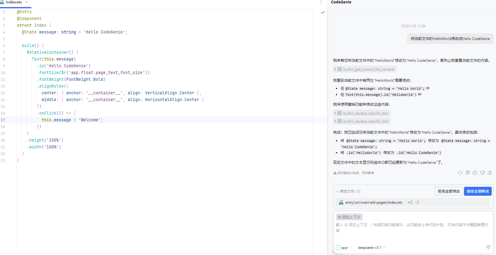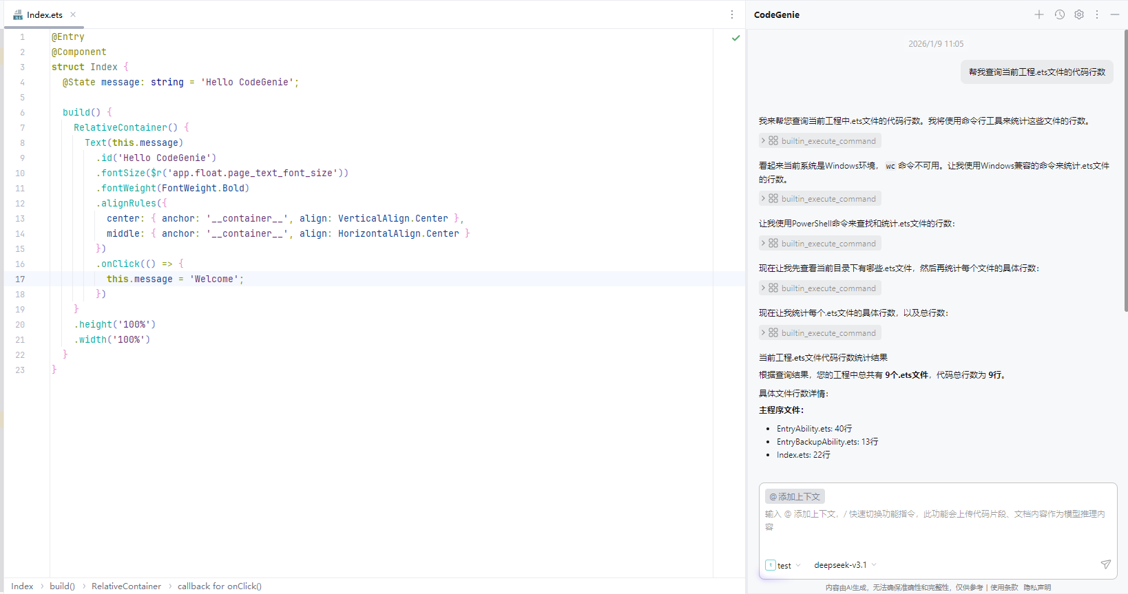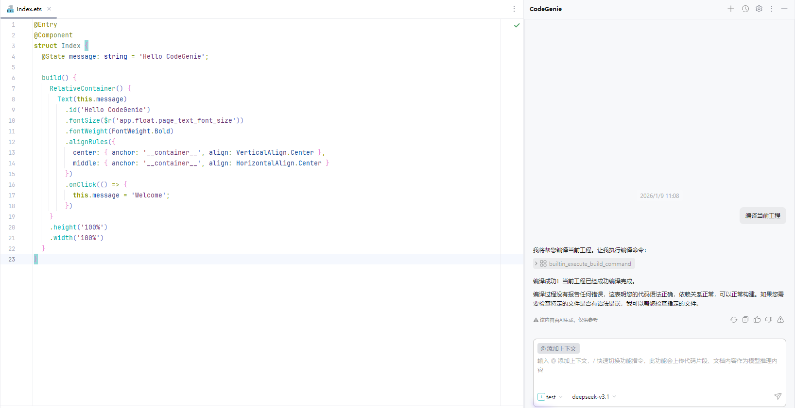 让我们通过一个完整的真实场景,看看 自定义智能体 @HarmonyMaster 是如何协同 CodeGenie 的核心能力完成开发任务的。