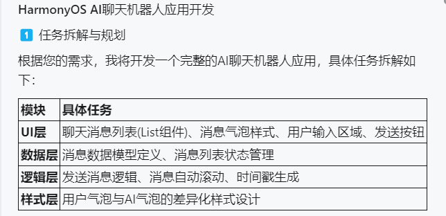 Text('AI聊天助手').fontSize(20).fontWeight(FontWeight.Medium).fontColor('# 000000')智能体在完成构建与修复动作以后,此时一个全新的鸿蒙AI聊天机器人应用就完成了,此时可以通过DevEco Studio自带的预览器实现聊天界面预览或通过智能体继续增加功能。***适配层/配置层**:处理配置文件(如 module.json5)或