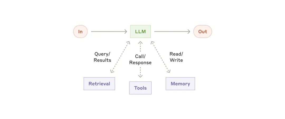 定义:类Agent系统最基础的模块是"增强的LLM",即具备检索、工具使用和记忆等功能的语言模型。Anthropic当前的模型能够主动使用这些功能——生成搜索查询、选择合适工具以及确定需要记忆的信息。