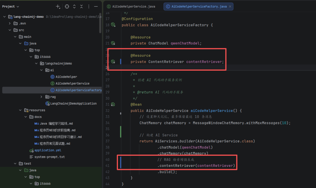 @Beanpublic AiCodeHelperService aiCodeHelperService() { // 设置聊天记忆,最多保留最近 10 条消息 ChatMemory chatMemory = MessageWindowChatMemory.withMaxMessages(10); // 构建 AI Service return AiServices.builder(AiCodeHelperService.class) .chatModel(qwenChatModel) .chatMemory(chatMemory) // RAG 检索增强生成 .contentRetriever(contentRetriever) .build();}