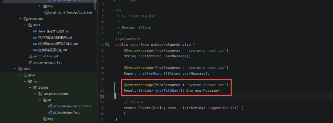 修改 AiCodeHelperService 新增 `chatWithRag`:
