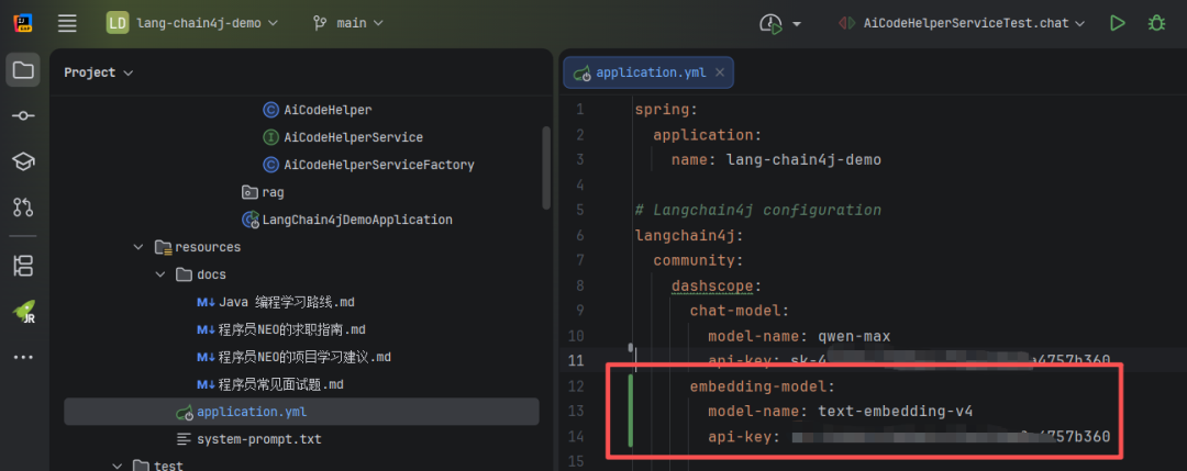 在 Spring Boot 配置文件中添加 Embedding 模型配置,使用阿里云提供的 text-embedding-v4 模型: