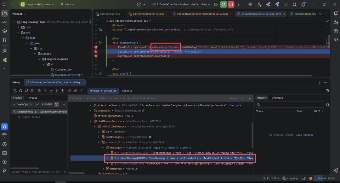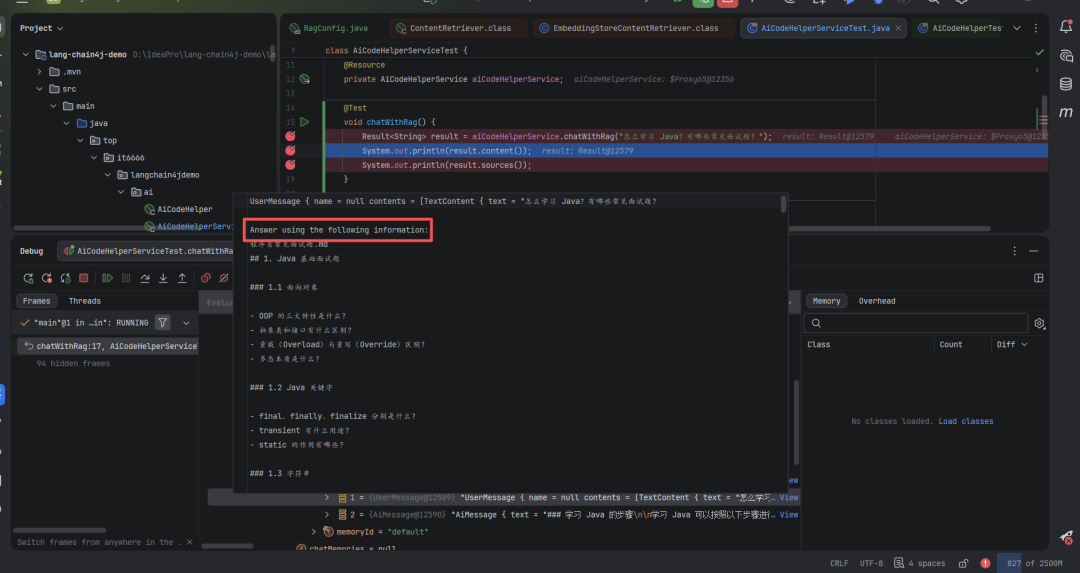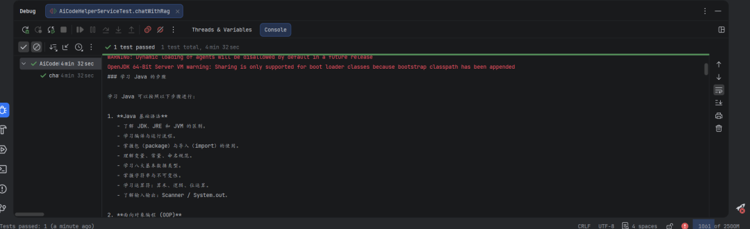 @Testvoid chatWithRag() { Result<String> result = aiCodeHelperService.chatWithRag("怎么学习 Java?有哪些常见面试题?"); System.out.println(result.content()); System.out.println(result.sources());}