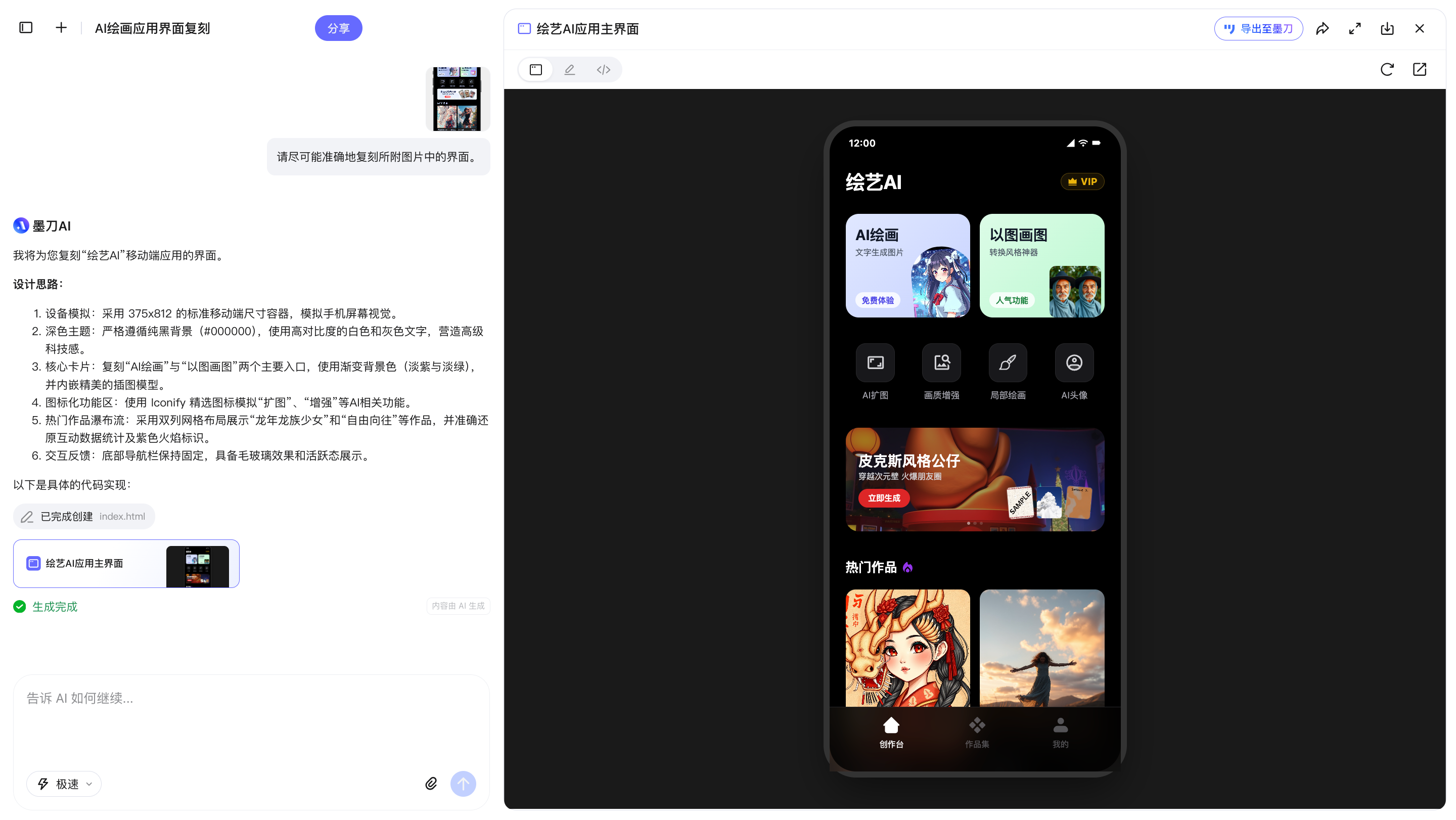 就拿原型设计来说,现在已经有一些工具在尝试打通“调研-设计-开发”。例如在墨刀AI里,你扔进去一份市场调研的文档,AI先给你梳理出产品功能,然后一键转化成基础原型,甚至还能把给开发的评审标注、测试用例都给你顺手搭个框架出来。前期调研、需求文档到界面设计,还有研发评审,整个链条它都能包揽。